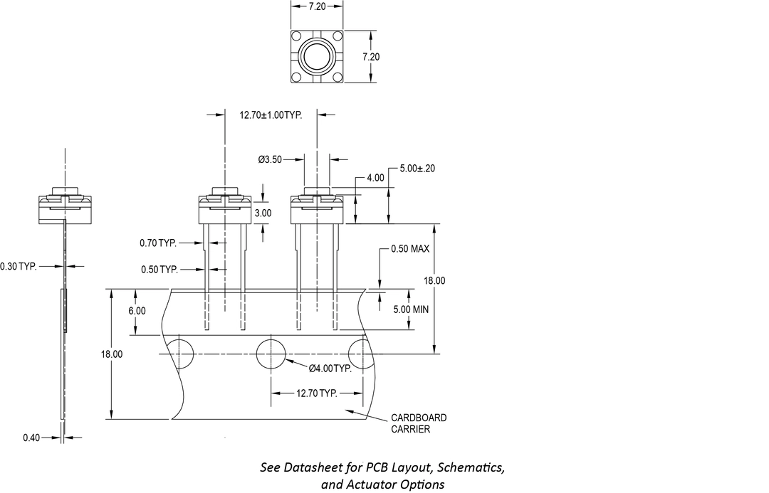 The CR1104S Series tactile switch is in ammo packaging for ease of use. This IP67 process sealed switch offers packaging in three different quantities. Actuation force choices are 200gF and 260gF with actuator travel of .30 ± .2mm. Actuator length options range from 4.3mm to 7.0mm.