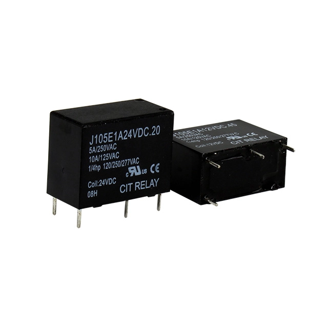 The J105E Series relay, capable of handling up to 10A, comes in a compact and lightweight design. It features low coil power consumption while supporting high contact loads, with contact configurations of 1A or 1C and voltage options ranging from 3VDC to 24VDC. Available coil power options include 0.20W and 0.45W. The relay’s dimensions are 20.59 x 10.15 x 15.75mm, and UL agency approval is E197851.