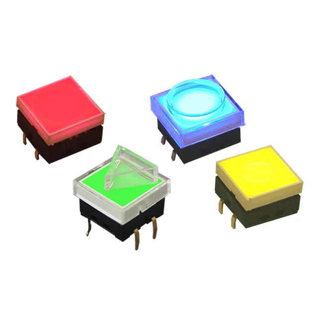 12mm square, the illuminated JS Series tactile switch is SPST and momentary. LED color options are red, green, yellow or blue. The JS Series offers seven different clear cap options that with choices such as round, square, triangle, round concave, and flush.