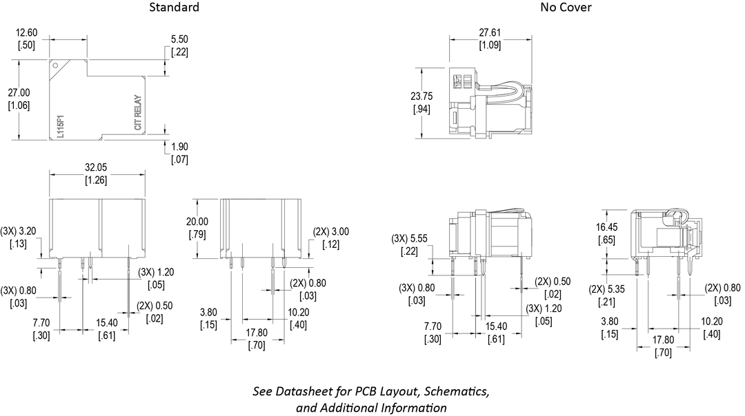 The latching L115F1 Series relay offers heavy contact load in a light-weight and small size package. This PC pin mounted relay offers single coil latching with 1A, 1B or 1C contact arrangement. Coil voltage ranging from 5VDC up to 48VDC with coil power of 90W or 1.5W. Dimensions are 26.9 x 31.7 x 20.3mm. The L115F1 is available with or without a dust cover. UL Agency approval is UL E197852.
