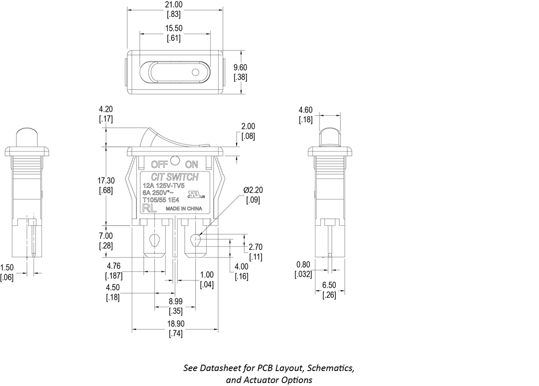 The RL Series rocker switch is sub-miniature in size and SPST. Multiple latching options are available with quick connect/solder lug termination. Switch function is Off-On or Off-(On). The versatile RL series offers multiple housing color, actuator color, and actuator marking color choices. IP40 Sealing Degree.
